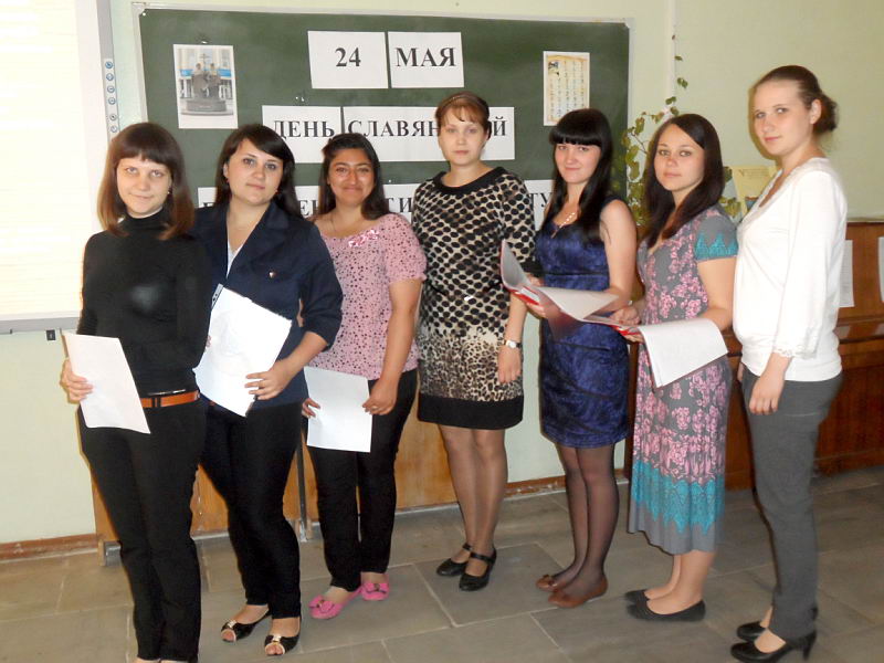 24 мая 2013 года в ГБОУ СПО «Лукояновский педагогический колледж им.А.М.Горького» состоялся праздник, посвящённый Дню славянской письменности и культуры. Студенты 321 группы дисциплины дополнительной подготовки «Русский язык и литература» под руководством преподавателя русского языка Аброшновой М.А. провели викторину среди студентов первых и вторых курсов, подготовили сценарий праздника, в котором раскрыли значимость дела Кирилла и Мефодия. Цель проведённого мероприятия: распространение славянских традиций и популяризация славянской культуры среди обучающихся колледжа. |