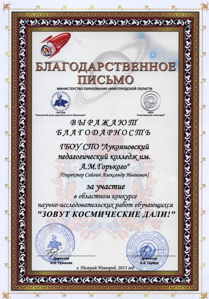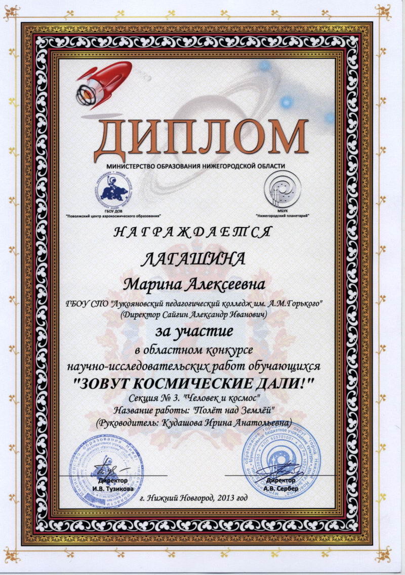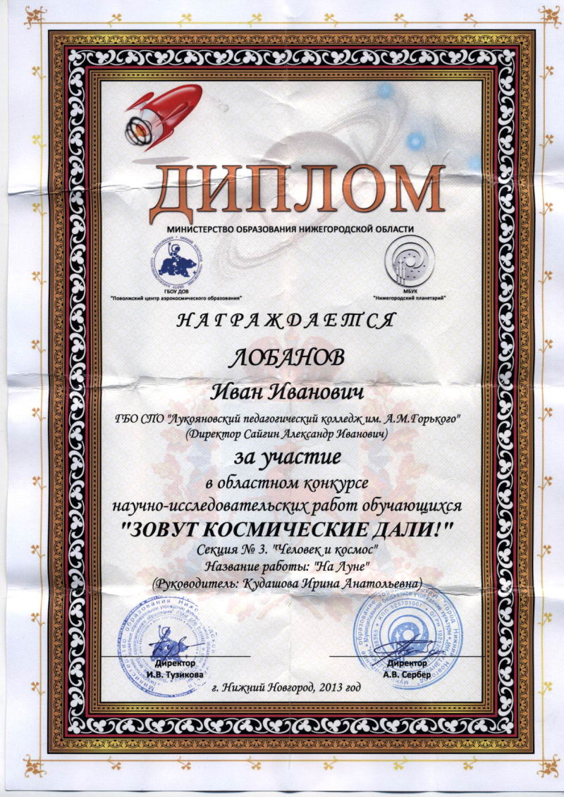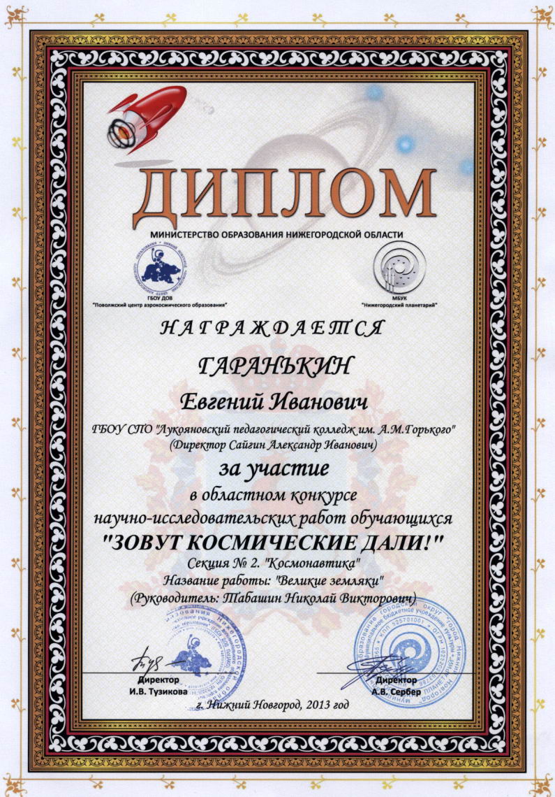 17 мая Лукояновский педагогический колледж принял участие в финале Областного конкурса научно-исследовательских работ обучающихся под названием "Зовут космические дали!", который состоялся в МБУК "Нижегородский планетарий". В работе секции "Космонавтика" приняли участие 13 групп, включая группу из 7 студентов ЛПК с руководителем Н.В.Табашиным. Студенты ЛПК Евгений Гаранькин и Алексей Катихин представили свою работу на тему "Великие земляки" и по итогам конкурса были награжлены дипломом за II место. Всем участникам конкурса были вручены дипломы за участие. Другими образовательными учреждениями были представлены работы по темам: "Гамма-всплеск: возможная угроза нашей планете", "Космические исследования", "История развития космонавтики", "Почему затопили орбитальную станцию МИР?", "Проект ЛУНА-25" и другие. |