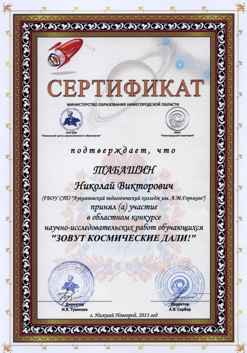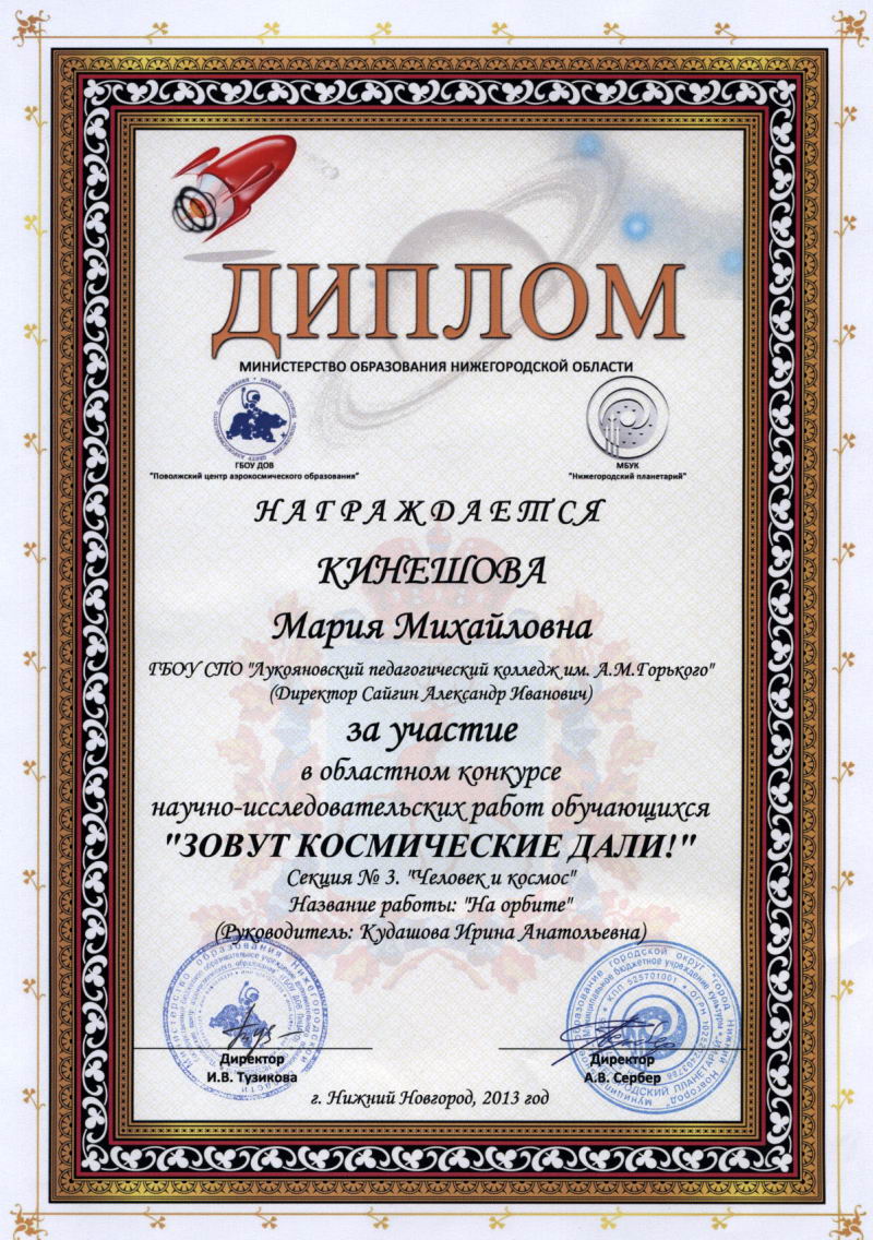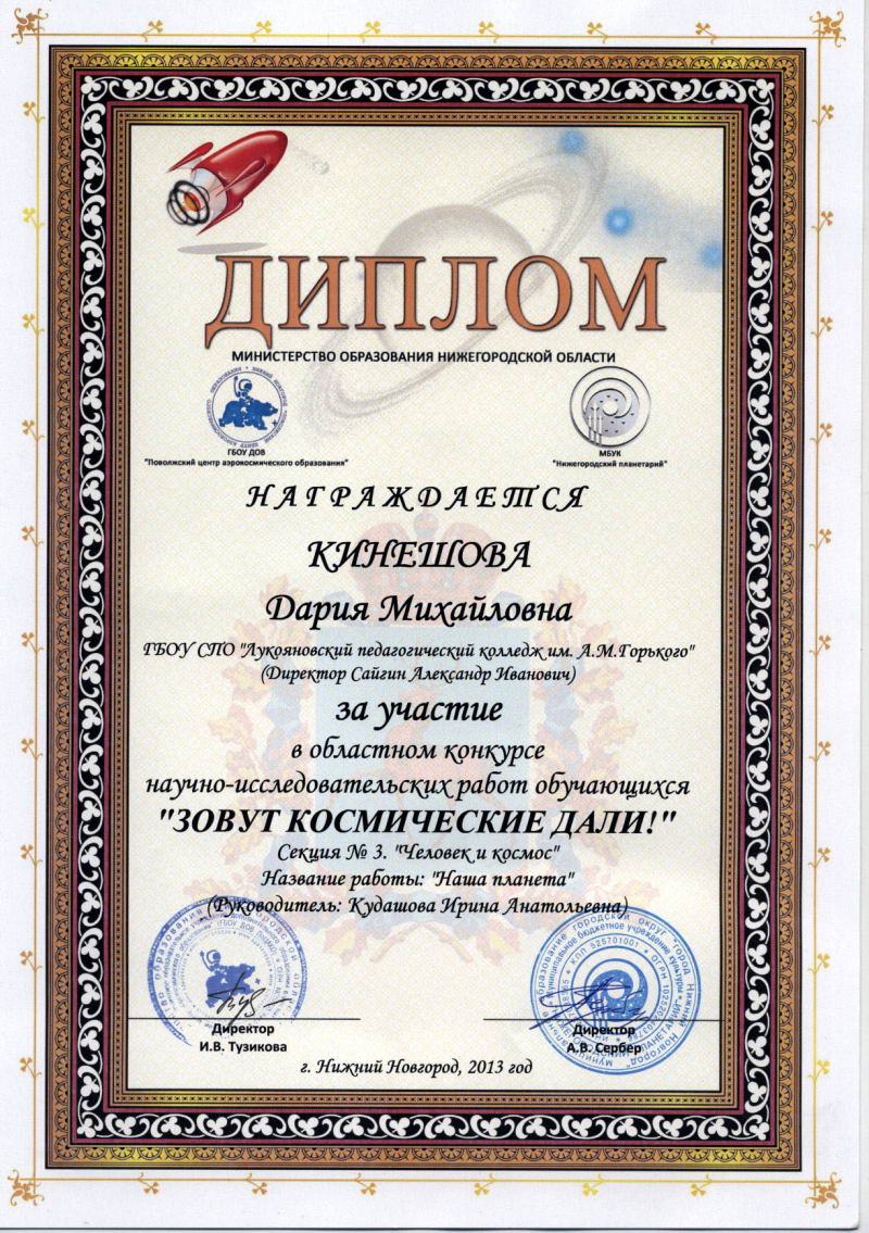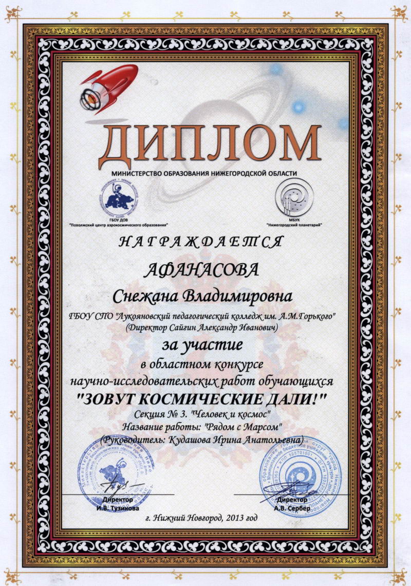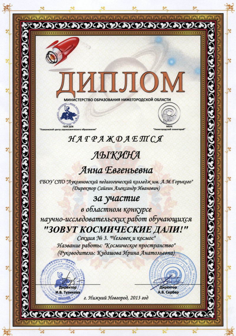 17 мая Лукояновский педагогический колледж принял участие в финале Областного конкурса научно-исследовательских работ обучающихся под названием "Зовут космические дали!", который состоялся в МБУК "Нижегородский планетарий". В работе секции "Космонавтика" приняли участие 13 групп, включая группу из 7 студентов ЛПК с руководителем Н.В.Табашиным. Студенты ЛПК Евгений Гаранькин и Алексей Катихин представили свою работу на тему "Великие земляки" и по итогам конкурса были награжлены дипломом за II место. Всем участникам конкурса были вручены дипломы за участие. Другими образовательными учреждениями были представлены работы по темам: "Гамма-всплеск: возможная угроза нашей планете", "Космические исследования", "История развития космонавтики", "Почему затопили орбитальную станцию МИР?", "Проект ЛУНА-25" и другие. |