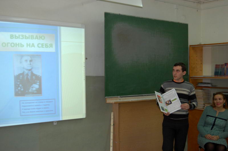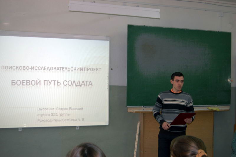 Урок мужестваВ 2015 году мы празднуем 70-летие победы в Великой Отечественной войне. Эту Победу мы ковали все вместе: люди, воевавшие на фронтах и люди, работавшие в тылу. 6-7 мая 2015 года в музее Лукояновского педагогического колледжа была подготовлена выставка литературы, посвященной преподавателям и студентам участникам ВОВ, и проведены уроки мужества, посвященные подвигу преподавателей и студентов, воевавших на фронтах войны, для групп 1-2 курсов. Студентам рассказали о жизни училища в годы ВОВ, о труде преподавателей и студентов. Особую гордость нашего колледжа представляют два выпускника предвоенных лет, удостоенных высокого звания Герой Советского Союза. Мы чтим и помним наших героев, поэтому рассказывать о них является для нас ныне живущих почетной и священной обязанностью. Студент Василий Петров |