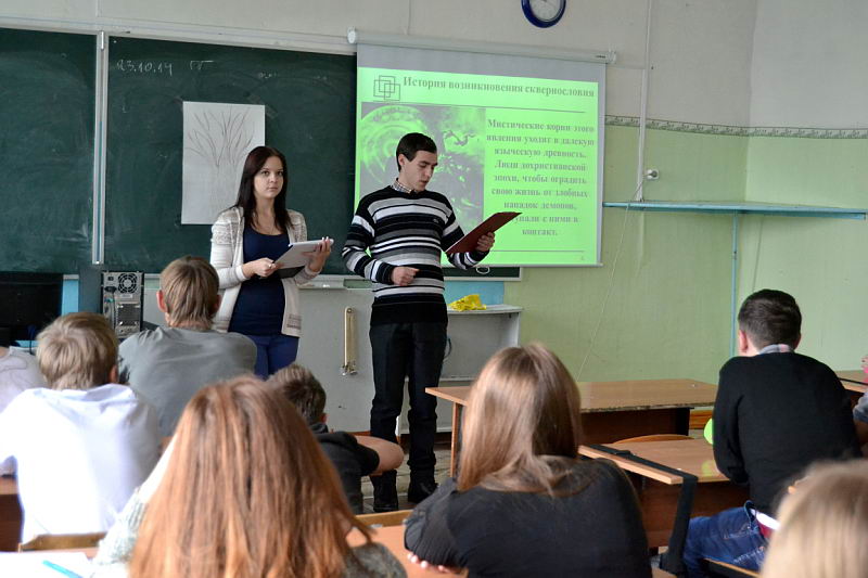 Лекции о вреде сквернословияСтуденты волонтерского объединения ЌЗа здоровый образ жизниџ и активисты студенчского самоуправления провели лекции о вреде сквернословия для учеников Лукояновской школы ± 1 и для студентов первых курсов Лукояновского педагогического колледжа. Это мероприятие проводилось в целях формирования ценностного отношения к русскому языку как составной части национальной культуры; формирования негативного отношения молодежи к нецензурной лексике; профилактики проблемы слов-паразитов и бранных слов. Главными задачами лекции были: