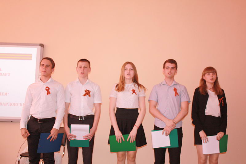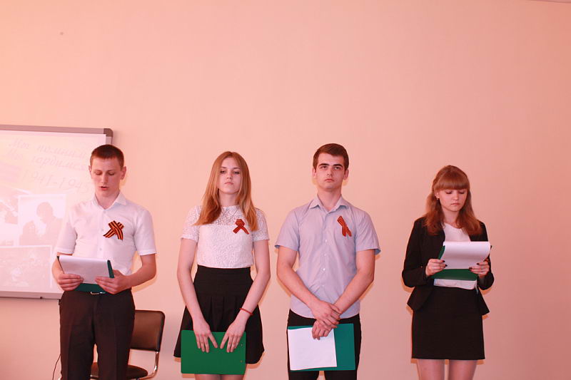 Ко Дню Победы в колледже прошёл конкурс патриотической песни «Я помню. Я горжусь.». В мероприятии приняли участие студенты всех учебных групп, прозвучали песни военного времени и современные песни о войне в сольном и хоровом исполнении. Вели конкурс студенты Дарья Саркисова и Александр Зиновьев, руководитель С.В.Мокшина. |