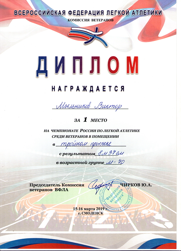 15-18 марта в легкоатлетическом манеже города Смоленск состоялся лично-командный Чемпионат России по легкой атлетике среди ветеранов в закрытом помещении. В составе команды Нижегородской области выступал преподаватель нашего колледжа Мыльников Виктор Николаевич. Итог его участия в главном российском соревновании по легкой атлетике для ветеранов спорта прекрасен. В своем основном виде тройном прыжке Виктор Николаевич одержал убедительную победу, завоевав таким образом высокое звание Чемпиона России! Соревнование по тройному прыжку проходили во второй день Чемпионата, а в первый день Виктор Николаевич завоевал еще две бронзовые медали: в спортивной ходьбе на 3000 метров и в прыжках в длину с разбега. |