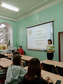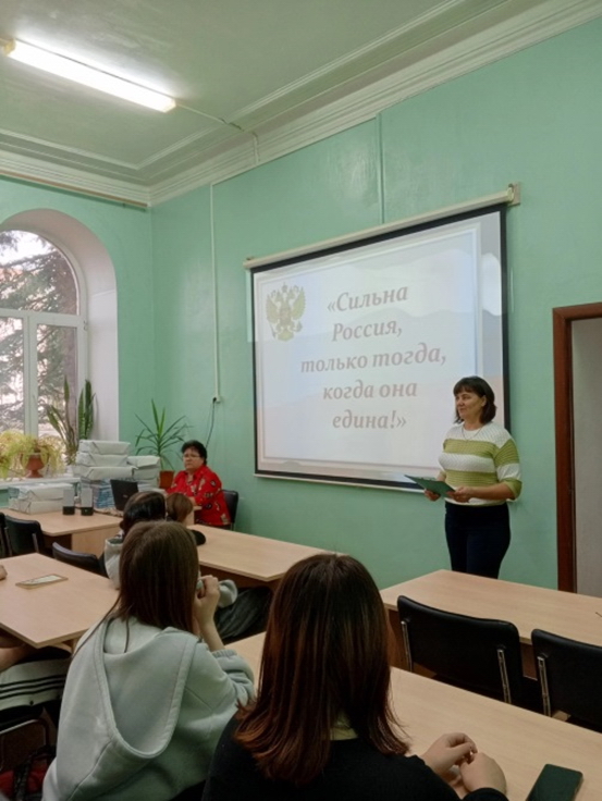 Ежегодно в России 4 ноября отмечается один из главных государственных праздников России День народного единства. Этот праздник дань глубокого уважения к тем знаменательным страницам отечественной истории, когда патриотизм и гражданственность помогли нашему народу объединиться и защитить страну от захватчиков. В читальном зале колледжа библиотекарями Сидневой С.В. и Суменковой И.Ю. проведен урок исторической памяти «День, который нас объединяет», приуроченный к празднованию Дня народного единства. Студенты 111,112 и 231 групп совершили экскурс в историческое прошлое нашей страны, узнали о далёких событиях Смутного времени, о роли Минина и Пожарского в судьбе России. В конце мероприятия все дружно отвечали на вопросы викторины. В ходе мероприятия ребята смогли понять, что история России учит нас, что порознь, поодиночке не сделать того, что можно сделать вместе. Единство и сплоченность великая сила. |