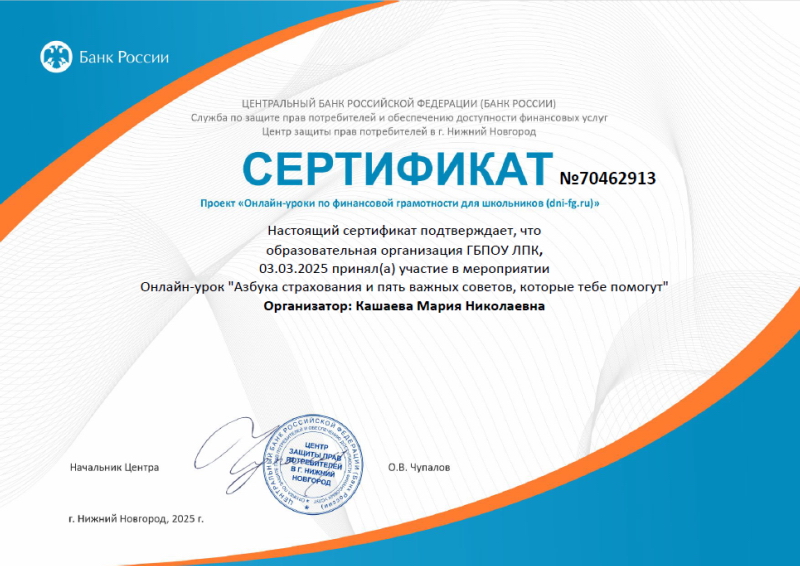 С 30 января 2025 года Банком России для учащихся средних и общих образовательных организаций продлятся «Онлайн-уроки финансовой грамотности для школьников». Онлайн уроки помогают старшеклассникам из любой точки России получить равный доступ к финансовым знаниям, предоставляет возможность «живого» общения с профессионалами финансового рынка, способствует формированию принципов ответственного и грамотного подхода к принятию финансовых решений. Эксперты рассказывают обучающимся о личном финансовом планировании, инвестировании, страховании, преимуществах использования банковских карт. Особое внимание уделяется правилам безопасности на финансовом рынке и защите прав потребителей финансовых услуг. 3 марта студенты 241 группы приняли участие в очередном онлайн-уроке весенней сессии «Азбука страхования и пять важных советов, которые тебе помогут». Обучающиеся узнали, что такое страхование, его смысл, изучили роли участников страховых отношений, так же узнали, как выбрать надежного страховщика, на что обращать внимание при заключении страхового договора и какая последовательность действий при наступлении страхового случая. Для закрепления материала урока обучающиеся ответили на вопросы интерактивной анкеты. В расписание весенней сессии включены 29 актуальных тем: 26 уроков по финансовой грамотности и 3 урока из цикла «Моя профессия».