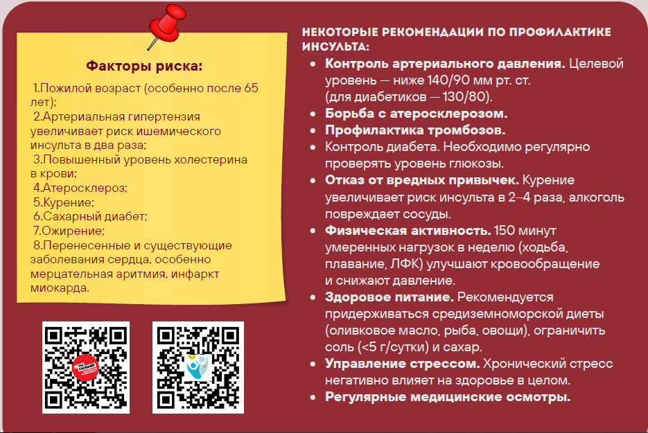 Ежегодно 29 октября отмечается Всемирный День борьбы с инсультом. Этот день обращает внимание каждого из нас на необходимость своевременной профилактики инсульта. Сегодня инсульт стал основной причиной инвалидизации во всем мире и второй по значимости причиной смерти. Почти все инсульты можно и нужно предотвратить и это можно сделать, внеся несколько простых изменений в свою жизнь. Какие основные факторы риска развития инсульта? - Первым и самым важным фактором развития этого заболевания является высокое артериальное давление. Гипертония в той или иной степени затрагивает до половины всего населения Земли. Часто, особенно на ранних стадиях, гипертония протекает без выраженных симптомов. При отсутствии своевременной диагностики и лечения гипертония приводит к повреждению кровеносных сосудов, что в свою очередь становится причиной ряда серьезных заболеваний, включая инсульт. Больше половины всех инсультов последствие гипертонии. Регулярное измерение артериального давления, его своевременная медикаментозная коррекция и изменение образа жизни путь к профилактике грозных осложнений гипертонии, включая инсульт. Сюда же можно отнести и нарушения ритма сердечных сокращений. Различные нарушения регулярности сердечных сокращений, в том числе тахикардия, мерцательная аритмия, при отсутствии лечения могут стать причиной развития инсульта. Такие инсульты протекают тяжелее прочих, и чаще приводят к летальному исходу. Однако, при своевременной диагностике и лечении нарушений ритма, эти инсульты можно предотвратить. Также стоит отметить, что 1 из 5 человек, перенесших инсульт, страдает сахарным диабетом II типа. Диабет диагностируется врачом с помощью простого анализа крови. Диабет можно контролировать с помощью лекарств, диеты и физических упражнений. - Специалисты здравоохранения утверждают, что важной профилактической мерой инсульта являются ведение здорового образа и отказ от вредных привычек. - Это утверждение верно на 100%. Ежегодно более 1 миллиона инсультов происходит как следствие недостаточной физической активности. Простой способ снизить риск развития инсульта увеличить интенсивность и продолжительность своей ежедневной физической активности. Всего 30 минут упражнений умеренной интенсивности пять раз в неделю могут снизить риск развития инсульта на 25%. Далее стоит сказать о питании. Более половины всех инсультов связаны с последствиями несбалансированного питания, но внесение небольших изменений в привычный рацион может существенно повлиять на снижение риска. Здоровое, рациональное питание поможет сохранить здоровый вес, нормализовать артериальное давление и снизить уровень холестерина, а в результате предотвратить инсульт. Существенно снижает риск инсульта рацион, основанный на растительных продуктах, с умеренным количеством мяса и рыбы. Первые два фактора «тянут» за собой третий избыточная масса тела. Лишний вес повышает риск развития инсульта на 22%, а при ожирении, этот риск увеличивается на 64%. Вероятность инсульта повышается как следствие гипертонии, ишемической болезни сердца, и диабета II типа, которые развиваются на фоне избытка массы тела. Также обращу внимание, что примерно 1 из 6 инсультов связан с последствиями депрессии или стресса. Каждому человеку стоит научиться контролировать свои э