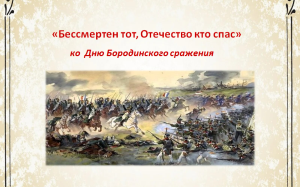 8 сентября День Бородинского сражения русской армииВ начале осени, 8 сентября, Россия вспоминает о памятной дате годовщине Бородинского сражения. В 1812 году в этот день состоялась крупнейшая битва между русской и французской армией. В день этой битвы, 8 сентября, отмечается День воинской славы России День Бородинского сражения русской армии под командованием М.И. Кутузова. Про день Бородина написаны тысячи книг, монографий и научных статей. Кажется, об этой битве известно все. Но, как и любое легендарное историческое событие, оно обросло многочисленными мифами и домыслами. В 1961 г. Бородинское поле получило статус государственного военно-исторического заповедника. В настоящее время на территории музея-заповедника находятся более 200 памятников и памятных мест. Ежегодно в начале сентября на Бородинском поле проводится масштабная историческая реконструкция эпизодов сражения. Бородинская битва нашла отражение в литературе и искусстве, в память о сражении в СССР и РФ печатались монеты и почтовые марки. И мы предлагаем вам посмотреть презентацию, посвященное этому историческому событию. |