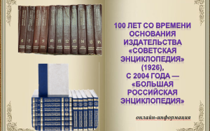 Большой советской энциклопедии 100 летИстория главного справочника страны показана через основные этапы ее изданий. Первым главным редактором БСЭ стал Отто Юльевич Шмидт, известный математик, географ, геофизик, астроном, путешественник. Он собрал группу редакторов из разных областей знаний и издательской сферы. В течение 1924 года был разработан план новой энциклопедии, приняты решения о порядке выпуска, об отделах редакции и классификации знаний. Первый том увидел свет в 1926 году. Полное издание энциклопедии составило 65 томов и один дополнительный, целиком посвященный СССР. Первое издание БСЭ было закончено в 1947 году. Второе издание БСЭ выходило в период с 1949–1957 гг. Главным редактором этого издания был Сергей Иванович Вавилов (1891–1951), советский физик, основатель научной школы физической оптики в СССР, общественный деятель и популяризатор науки, младший брат генетика Николая Ивановича Вавилова. После смерти С. И. Вавилова в 1951 году главным редактором стал академик Б. А. Введенский (1893–1969). Второе издание БСЭ состояло из 51 тома. Третье издание БСЭ выходило в период с 1969 по 1978 гг. Главный редактор академик Александр Михайлович Прохоров (1916–2002), советский и российский физик, один из основоположников важнейшего направления современной физики квантовой электроники, лауреат Нобелевской премии по физике за 1964 год, один из изобретателей лазерных технологий. Тираж третьего издания составил около 630 тысяч экземпляров (что в среднем в 8–12 раз больше, чем первое издание и в 2–2,5 раза больше, чем второе). В подготовке издания участвовало около 10 тысяч специалистов. |
