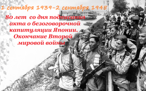 «80 лет со дня подписания акта о безоговорочной капитуляции Японии. Окончание Второй мировой войны»Окончание Второй мировой войны это великое событие для всего мира. Именно в этот день был побежден нацизм и фашизм, прекращено преступление против всего человечества. Ключевую роль в этой Победе сыграл Советский Союз и его храбрые воины: они сражались не только за свою Родину. Советские солдаты гнали врага до самого Берлина, изгоняя его с территорий других государств, захваченных нацистской Германией и ее союзниками. Страшное зло могло распространиться по всему миру, если бы советский народ не одержал Победу в главном противостоянии Второй мировой Великой Отечественной войне. Точка во Второй мировой войне была поставлена Красной Армией на Дальнем Востоке. Блестяще проведенная Маньчжурская операция стала завершающей битвой Второй мировой, после которой последний союзник нацистской Германии милитаристская Япония была вынуждена капитулировать. 2 сентября Япония подписала Акт о безоговорочной капитуляции, а 3 сентября Советский союз праздновал Великую победу. В 2020 году этот день объявлен днем воинской славы России Днем окончания Второй мировой войны. Мы должны помнить и чтить подвиг наших предков и их вклад в мирную жизнь современных государств. |