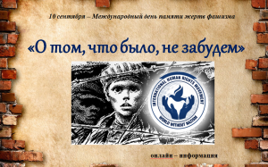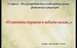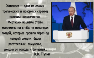 «Холокост: трагедия, память, судьбы»Ежегодно 27 января во всем мире отмечается Международный день памяти жертв Холокоста, в этот день солдаты Красной Армии освободили заключенных концлагеря Освенцим. С 2006 года, по решению Генеральной Ассамблеи ООН, этот день объявлен Международным днём памяти жертв Холокоста. Это одна из самых известных трагедий двадцатого века преднамеренной попытке полного истребления целых наций, включая мужчин, женщин и детей. Трагедия Холокоста это не только часть истории евреев, русского народа, а также это Катастрофа всего человечества, это, в сущности, кризис мировой цивилизации, получивший продолжение в Афганистане, Сирии, Чечне, в терактах по всему миру. И мы не должны об этом забывать, а знание свое обязаны передавать детям и внукам. «Пока мы помним мы живы. И жива память о миллионах погибших» |