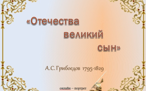 Александр Сергеевич ГрибоедовАлександр Сергеевич Грибоедов (1795 1829 гг.) личность многогранная и талантливая. Он поэт и музыкант, драматург и блестящий дипломат. Популярность и бессмертие ему принесла его гениальная комедия «Горе от ума». Родился в Москве в обеспеченной родовитой семье. В 6-летнем возрасте свободно владел тремя иностранными языками, в юности уже шестью. Получил домашнее образование под руководством учёного-энциклопедиста И. Б. Петрозилиуса. Окончил Московский университет, а во время Отечественной войны 1812 года записался в армию. Служил до 1816 года, выйдя в отставку в звании корнета. В 1817 году поступил на службу в Петербургскую Государственную Коллегию иностранных дел. С 1818 года служит секретарём в российском посольстве в Персии. Ответственно относясь к государственной службе, он параллельно изучает языки и литературу о культуре Востока. В 1824 году Грибоедов завершает комедию «Горе от ума», в которой едко критикует московскую аристократию. Публикация сталкивается с трудностями, печатают только её отдельные части. Полностью пьеса была напечатана лишь в 1860 году. В 1828 году Александр Сергеевич женился на пятнадцатилетней княжне Нине Александровне Чавчавадзе. Они прожили вместе всего несколько недель: вскоре после свадьбы Грибоедов уехал в Тегеран. Спустя несколько месяцев он погиб от рук исламистов-фанатиков, напавших на русское посольство. |