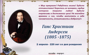 Ганс Христиан Андерсен2 апреля 2015 года исполняется 210 лет со дня рождения датского сказочника, поэта, писателя, драматурга Ганса Христиана Андерсена. Ганс Христиан Андерсен известный на весь мир писатель из Дании, подаривший читателю такие популярные во все времена сказки, как « Гадкий утенок», «Принцесса на горошине», «Снежная королева», «Дюймовочка» и другие. Дети и взрослые по всему миру отлично знают имя известного писателя из Дании Ганса Христиана Андерсена, произведения которого можно читать на 150 разных языках. Не в одном поколении дети с удовольствием слушают, как родители им читают интересные сказки популярного мастера пера. Достаточно вспомнить «Принцессу на горошине» или «Дюймовочку», мультики о Герде или Русалочке. Увлекательный мир, описанный автором в сказках, знакомясь с которым можно проследить и актуальные философские мысли, притягателен для читателей самых разных возрастов. Легкий стиль повествования в произведениях таит в себе глубокий смысл, помогающий задуматься над важными в жизни человека вещами. |