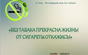 31 мая отмечается Всемирный день без табакаДень был учреждён в 1987 году Всемирной организацией здравоохранения (ВОЗ) для привлечения глобального внимания к табачной эпидемии и её смертельным последствиям, а также к эффективным мерам политики по снижению уровня потребления табака. В этот день проводятся просветительские акции и мероприятия, спортивные соревнования и забеги, организовываются конференции и семинары. Глобальная цель Всемирного дня без табака содействие защите нынешнего и будущих поколений не только от разрушительных последствий для здоровья, но также и от социальных, экологических и экономических бедствий, связанных с употреблением табака и воздействием табачного дыма. В России ко Всемирному дню без табака приурочена Неделя отказа от табака, которая в 2025 году проводится с 26 мая по 2 июня. |