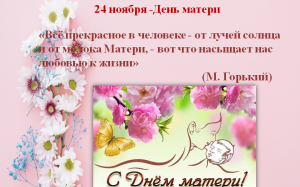 День материЗа прошедшие годы День матери стал одним из любимейших российских праздников. Каждый год в последнее воскресенье ноября принято поздравлять не только мамочек, но и бабушек. В последние годы становится доброй традицией чествовать и награждать в честь праздника многодетных матерей и матерей, которые берут на воспитание детей-сирот. Маму не заменит никто и никогда. Наверное, сколько бы теплых и добрых слов мы не говорили нашим матерям, все равно этого будет мало. Берегите, любите и уважайте своих мамочек, делайте все, чтобы они могли вами гордиться, делите с ними все их радости и беды, звоните им не только по выходным, а каждый божий день. Обязательно искренне и нежно поздравьте их в последнее воскресенье ноября, преподнесите стихи, подарки, цветы и сладости. Будьте с ними в этот день и возьмите на себя все их домашние повседневные хлопоты. Если же вы далеко, просто позвоните своей маме утром в праздничный день и поздравьте. Новый праздник День матери постепенно входит в российские дома. И это замечательно: сколько бы хороших, добрых слов мы не говорили нашим мамам, сколько бы поводов для этого ни придумали, лишними они не будут. |