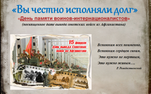 День памяти россиян, исполнявших служебный долг за пределами Отечества15 февраля отмечается День памяти россиян, исполнявших служебный долг за пределами Отечества. Эта дата выбрана не случайно: 15 февраля 1989 года, последние колонны советских войск перешли реку Амударью и окончательно покинули территорию разоренного гражданской войной Афганистана. Боевые действия, продолжавшиеся десять лет и унесшие жизни 15 тысяч наших соотечественников, оказались самым трудным военным испытанием для СССР со времен Великой Отечественной войны. Следует подчеркнуть, что в День памяти о россиянах, исполнявших служебный долг за пределами Отечества, мы вспоминаем не только ветеранов войны в Афганистане, но и 1,5 миллиона наших соотечественников, принявших участие более чем в 30 вооруженных конфликтах. 25 тысяч соотечественников отдали свои жизни, исполняя служебный долг в различных точках земного шара: в Корее и Вьетнаме, Сирии и Египте, Мозамбике и Анголе. Воины-интернационалисты внесли значимый вклад в укрепление славных традиций Российской армии. |