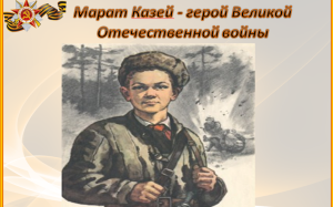 Марат КазейМарат Казей мальчик, чье детство забрала война. Ребенок героически лишился жизни во имя победы над фашистами. Смерть матери породила ненависть в сердце Марата и ушел в партизанский отряд, где наравне со взрослыми Марат сражался за Родину, не жалея своих сил. Он смело выполнял самые сложные задания, а его юность, ловкость, ум помогали в сложных ситуациях не только самому мальчику, но и всему отряду. Но весной 1944 года жизнь юного партизана трагически оборвалась. За мужество и смелость Марат, которому в конце 1943 года исполнилось всего 14 лет, был награждён орденом Отечественной войны 1-й степени, медалями «За отвагу» и «За боевые заслуги». Памятник Марату установлен в Минске, его именем названы несколько улиц в городах Белоруссии и в странах бывшего СССР. |