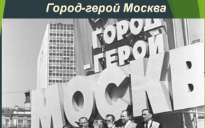 "Москва город-герой"8 мая 2025 года исполняется 60 лет со дня присвоения Москве город герой. 22 июня 1941 года фашистская Германия без объявления войны обрушила на Советский Союз всю свою военную мощь. Гитлеровцы устремились к Советской столице, предприняв на Московском направлении операцию пси кодовым названием «Тайфун». Фашисты планировали Москву сначала взорвать, а потом затопить, превратив ее в огромное водохранилище. И в честь немецкого оружия, на берегу должна была встать гордая стела из красного гранита, приводящая в трепет народы. Фронтовая Москва…. Навсегда запечатлелись в памяти москвичей темное небо, исполосованное светом прожекторов, стальные противотанковые ежи на перекрестках, колонны полков и дивизий, уходящих на фронт по улицам и проспектам. Враг был силен, борьба была ожесточенной. С воздуха фашисты сбрасывали зажигательные бомбы, гитлеровские танки рвались к окраинам города, подмосковные поселки, деревни, города были объяты пламенем. Наши войска отступали с большими потерями. Фронт все ближе и ближе подвигался к Москве. Фашисты надеялись испепелить и сровнять с землей нашу столицу. Тогда в подмосковных полях решалась судьба народа, Отечества. «Эту битву проиграть невозможно!» так думали все. 19 октября Государственный комитет обороны объявил: «Город на осадном положении. Главная задача отстоять Москву!». Усилиями всего народа непобедимым городом-солдатом встала Москва на пути захватчиков. В эти трудные дни, когда война подошла к стенам Москвы, столица оставалась тем штабом, откуда Ставка Верховного главнокомандования руководила боевыми действиями на фронтах и работой в тылу. В самые тяжелые дни обороны советская столица жила полнокровной жизнью. Не переставая, работали заводы, фабрики и транспорт. Промышленность Москвы становилась крупным арсеналом фронта, поставлявшим самолеты, танки, оружие, боеприпасы, медикаменты, обмундирование. Мужчин, ушедших на фронт, заменили женщины и подростки. Москву защищала вся многонациональная страна. У ее стен сражались шахтер из Донбасса и сибирский землепашец, казахский чабан и нефтяник из Баку. В рядах защитников столицы насмерть стояли сотни тысяч москвичей. Бойцы идут среди родимых пашен
