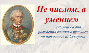 Александр Васильевич Суворов «Воевать не числом, а умением!»24 ноября 2024 года исполняется 295 лет со дня рождения великого русского полководца Александра Васильевича Суворова (1730 1800) непревзойденного стратега и тактика, продемонстрировавшего всему миру высочайший уровень владения воинским искусством побеждать, он вошел в военную историю как непобедимый русский полководец. Суворов не проиграл ни одного сражения, причем практически все свои победы полководец одержал не только меньшими силами, чем у неприятеля, но и во много раз меньшими людскими потерями, потому что Суворов по-отечески берег своих солдат. «Воевать не числом, а умением!» учил он своих солдат. Генералиссимус любил общаться с солдатами и в походе, и на привале, находя в этом знании солдатских тягот и нужд большую пользу. «Цари меня хвалили, солдаты любили, друзья мне удивлялись, враги меня ругали, придворные надо мною смеялись», так говорил о себе Александр Суворов. Основной труд книга «Наука побеждать», в которой изложил принципы тактики и методы обучения и воспитания войск (впервые издана в 1806). Суворов не только самый знаменитый военачальник в российской военной истории, но и один из самых известных полководцев в мире. |