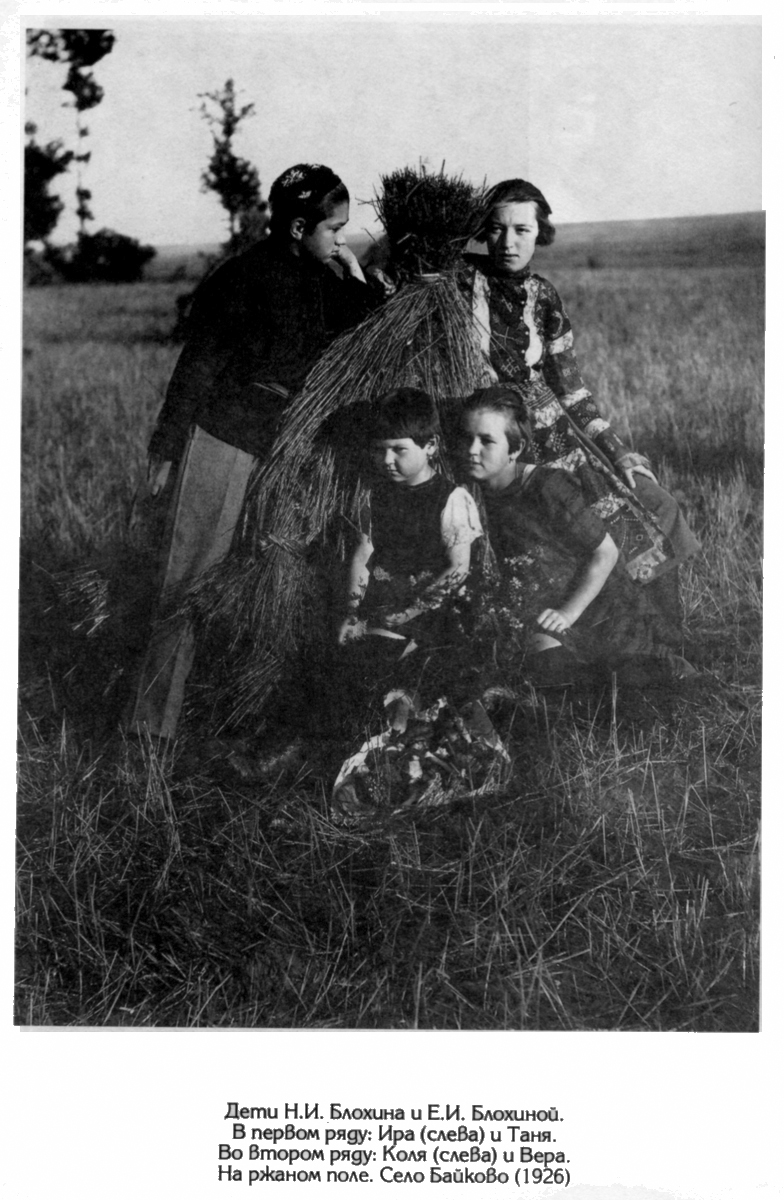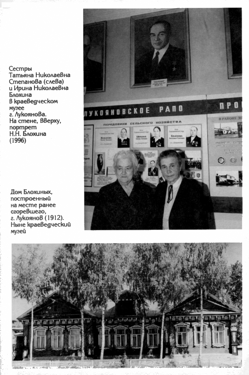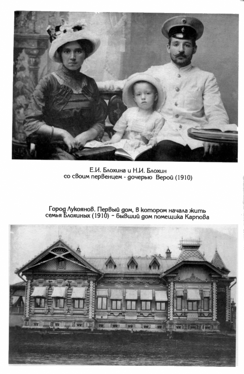 Но пока (до 1910) молодая пара жила в Москве, т.к. Николай продолжал учебу в университете; в Байкове и Лукоянове проводили летние каникулы. В 1908 году у Блохиных родилась первая дочь - Вера. В 1910 году в Лукоянов для работы в городской больнице приехал молодой врач Николай Иванович Блохин. Был он интеллигентным, заботливым и чутким, что как нельзя более соответствовало облику земского врача; врач не жалел своего времени, чтобы помочь людям, в дождь и метель спешил в дальние села к пациентам. Лукояновцы, однако, хорошо знали, что к доктору можно прийти и домой...