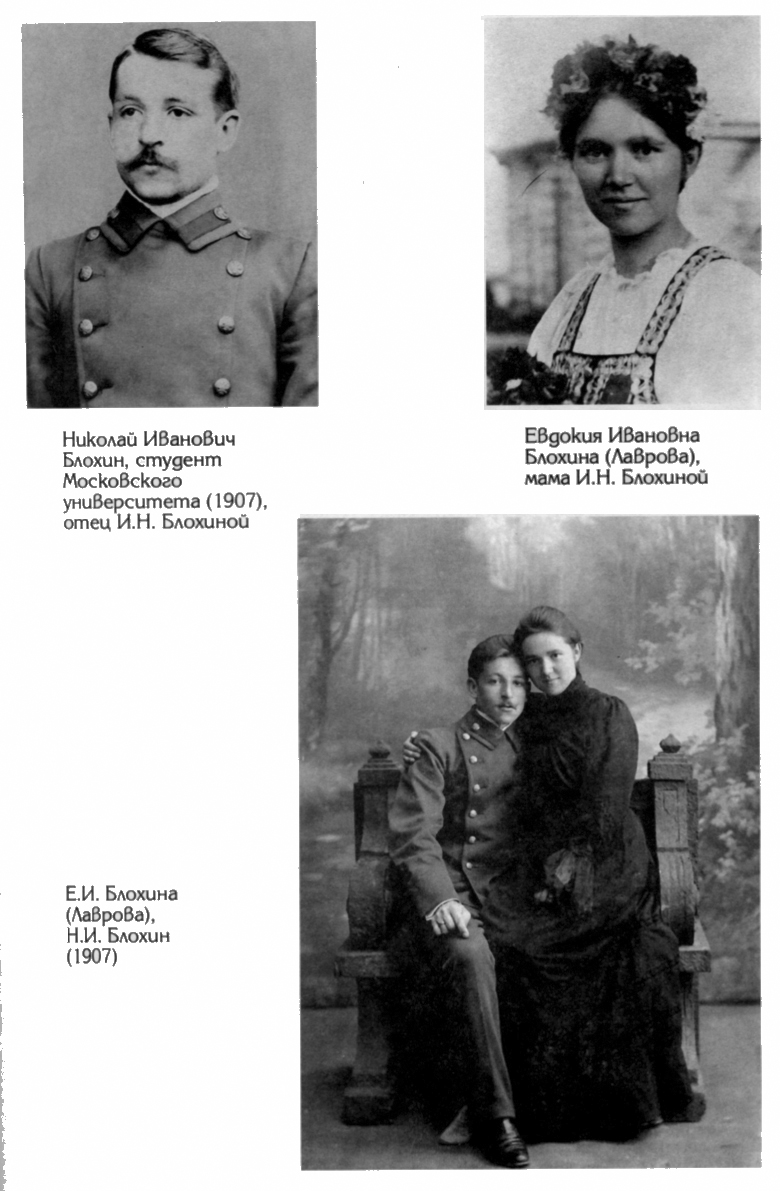 В 1906 г. Евдокия Ивановна Лаврова закончила гимназию в г. Арзамасе. В этом же году она познакомилась с приехавшим в Арзамас на летние каникулы студентом Московского университета Николаем Блохиным. Он учился на медицинском факультете и после окончания университета намеревался работать врачом в Лукояновском уезде.