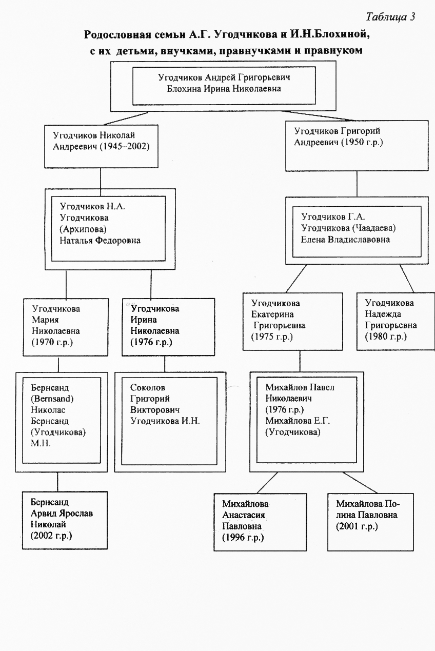 Андрей Григорьевич Угодчиков женился в 1941 году на Ирине Николаевне Блохиной (сохранила свою девичью фамилию). От этого брака родились: Николай Андреевич Угодчиков (1945 - 2002) и Григорий Андреевич Угодчиков 1950 г. р. (см. далее таблицу 3).