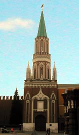 Никольская башняНикольская башня Кремля, проездная, на восточной стене, выходит на Красную площадь близ Исторического музея. Построена в 1491 году итальянским архитектором Пьеро Антонио Солари [название от бывшего Николаевского (Никольского) греческого монастыря]. Квадратная в плане, имела три боевых яруса, верхняя площадка и отводная стрельница бойницы навесного боя (машикули). По бокам отводной стрельницы каменные бастионы (срыты в начале XIX века). Увенчана шатром в конце XVIII века, в 1806 году перестроена по проекту архитектора К.И. Росси в готическом стиле. В 1812 верх Никольской башни взорван отступавшими французами, восстановлен в 1816 по проекту архитектора О.И. Бове. Башня сильно пострадала от артиллерийского огня в дни Октябрьских боев 1917 и была восстановлена по личному указанию В.И. Ленина (архитектор Н.В. Марковников). В 1935 на башне установлена звезда. Реставрирована в 1946-50 и 1973-74. Современная высота до звезды 67,1 метра, со звездой 70,4 метра. «Москва» . Энциклопедия. М.: СЭ, 1980