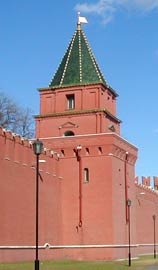 Петровская башняСвоё название башня получила от церкви митрополита Петра, располагавшейся на подворье Угрешского монастыря, находившегося в Кремле, рядом с башней. Петровская башня была разрушена пушечными выстрелами во время польской интервенции 1612 года и затем восстановлена. В 1771 году её сломали в связи с постройкой Кремлёвского дворца, но вскоре в 1783 году восстановили. В 1812 году башню взорвали отступавшие французские войска. Её отстроил заново архитектор О.И. Бове в 1818 году и с тех пор она не подвергалась изменениям. Петровская башня, возведённая для лучшего вида и прочности, служила для хозяйственных нужд кремлёвских садовников. Высота башни 27,15 метра.