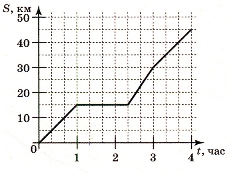 2. На рисунке изображен график, описывающий прямолинейное движение автомобиля. По горизонтальной оси отложено время (в часах), по вертикальной - расстояние от начала движения (в километрах). Через 15 км после начала движения автомобиль вынужден был остановиться для небольшого ремонта. Определите по графику, сколько минут длилась остановка.
