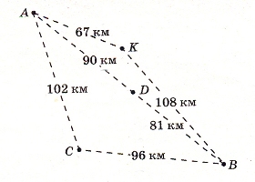 5. Три туристических маршрута из пункта А в пункт В пролегают через пункты C, D, и K. на первом маршруте расстояние от пункта А до пункта С туристы прошли за 6 дней, расстояние от пункта С до пункта В туристы преодолели за 5 дней. На втором маршруте расстояние от пункта А до пункта D туристы прошли за 5 дней, а расстояние от пункта D до пункта В - за 4 дня. На третьем маршруте расстояние от пункта А до пункта К туристы прошли за 4 дня, а расстояние от пункта К до пункта В - за 6 дней. Расстояния между соседними пунктами показаны на схеме. Найдите наибольшую среднюю скорость (в км/день) движения туристов из пункта А в пункт В.