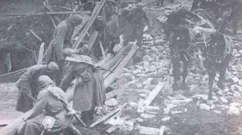 И вот настал день, когда комиссар нашей школы Кулаков сообщил, что наконец-то мы выдвигаемся на передний край. Эту новость мы встретили с большим энтузиазмом. На передовую шли с песнями, и не совсем еще до конца осознавали, почему плачут, глядя на нас, местные жители. Нам больше импонировали пацаны, бежавшие вслед за нами с радостными криками: "Вот эти дадут немцам!" За 1,5-2 километра от линии фронта хорошо стали видны то и дело, вспыхивающие на ночном небосводе разноцветные ракеты, пунктиры трассирующих пуль. Где-то ухали выстрелы орудий и совсем близко раздавались оглушительные разрывы снарядов и мин. Глубокой ночью мы тихо продвигались по лесу и в первый раз видели, что такое передний край: воронки от бомб и снарядов, развороченные повозки, обгорелые, расщепленные деревья, трупы лошадей, источавшие тяжелый дух... Под утро заняли исходную позицию на рубеже Житомир-Киев, и командир взвода младший лейтенант Забанов поставил очередную боевую задачу - взять дорогу на Киев. Безо всякой артподготовки подразделения перешли в наступление. Настроение было бодрым, в строю шутили, мол, так и до Берлина дошагаем. Тогда мы были слишком неопытны, и нас не насторожила легкость, с какой мы продвигались вперед. Однако вражеское сопротивление нарастало, уже появились убитые и раненые. Замполит, почувствовав неладное, заметил, что вроде бы немцы идут за нами. Увы, хитрый маневр фашистов был разгадан слишком поздно - нас рассекли на две группы и окружили. Положение усугублялось тем, что отсутствовала какая-либо связь со штабом бригады, и, следовательно, помощи ждать не приходилось. Фашисты все крепче сжимали кольцо, мы уже видели их каски, слышали гортанный немецкий говор, глаза ослепляли осветительные ракеты. Думаю, немцы тогда были уверены в том, что наша судьба предрешена, и мы сдадимся в плен. Отдельно скажу несколько слов о нашем комиссаре Кулакове. Он был участником боев у озера Хасан в 1938 году, за что заслужил награду-орден Красной звезды. На политзанятиях комиссар воспитывал в нас чувство патриотизма на примерах мужественных и героических поступков коммунистов и комсомольцев. После его рассказов у меня оставалось чувство, что это какие-то совершенно необыкновенные люди. Говорить и убеждать он умел очень хорошо. В сложившейся напряженной ситуации, наверное, не только у меня, но и у многих наших бойцов возник один и тот же вопрос: "Как же ты поступишь, комиссар?" Взоры всех были обращены только на него, ждали его решения. Но и в столь критической боевой обстановке наш комиссар оказался на высоте. Спокойным, уверенным голосом Кулаков скомандовал: "Примкнуть штыки!" С пистолетом в руке и возгласом: "За Родину! За Сталина! За мной, вперед!" - он устремился на врага. Курсанты, как один, поднялись и ринулись в свой первый, а для многих ставший последним, бой. Мы ворвались во вражеские боевые порядки, на ходу расстреливая, забрасывая фашистов гранатами. Завязалась рукопашная схватка, десантники ловко, как на занятиях, орудовали штыками винтовок СВТ. Для фашистов яростная, дерзкая атака стала неожиданностью, они, вооруженные автоматами, стремились оторваться от нас. И все-таки силы наши были слишком малы, чтобы разорвать кольцо. Кончались патроны, гранаты, замолкали пулеметы... Немало полегло наших ребят, убиты были командиры взводов, тяжело, в живот, ранен комисс